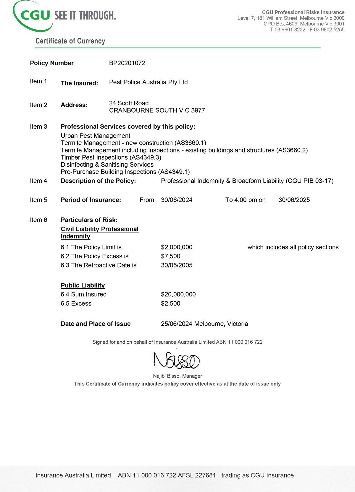 A private owned independent pest and termite control company and serving clients Melbourne Wide, Pest Police has been trusted by thousands of happy clients for timely quality service. Bigger is not better in the Pest Control industry, but neither is a one man operation. Boutique enough to care, we adjust quickly to suit our customer’s specific pest and termite control or other needs including no-interest payment plans for termite control, and direct contact with your knowledgeable technician and backed by our friendly office staff.